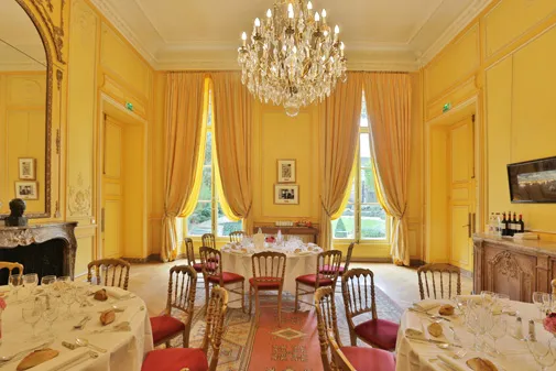 Ce salon de 63m² situé au rez de chaussée dispose d'une vue et d'un accès direct aux jardins. Il peut accueillir :